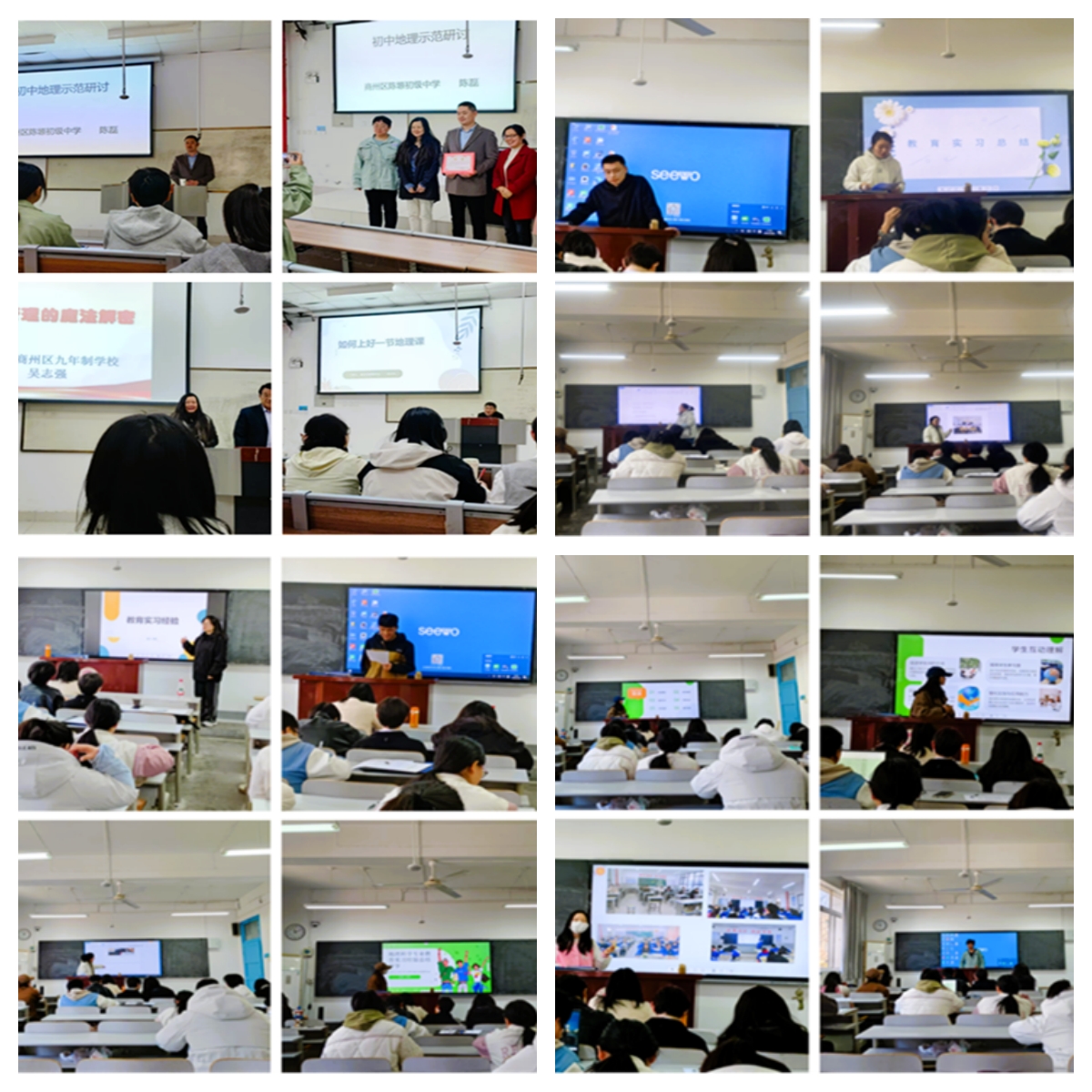 在教育研习期间,地理系荣幸地邀请到商州区陈塬初级中学的陈磊老师、商洛市初级中学的赵永恒老师、商洛市商州区九年制学校的吴志强老师,他们分别就《初中地理示范研讨》、《如何上好一节地理课》和《班级管理的魔法解密》进行了深入的经验交流分享。三位老师的精彩报告赢得了同学们的热烈掌声。在各位老师的精彩报告之后,学生们也围绕基础教育调研、班主任工作总结(主题班会)、教育实习经验、教学展示(教学过程和教学设计)等方面,开展了研习成果汇报,展示了他们在实践学校参与教研活动、组织学生实践等方面的成果,生动地呈现了实践过程中的收获与思考,展现了扎实的教学基本功和强烈的育人意识。与会老师对学生的研习汇报进行了细致的点评,并给予了客观评价,认为他们在教学目标设定、课程设计创新以及班主任管理能力等方面取得了显著进步。