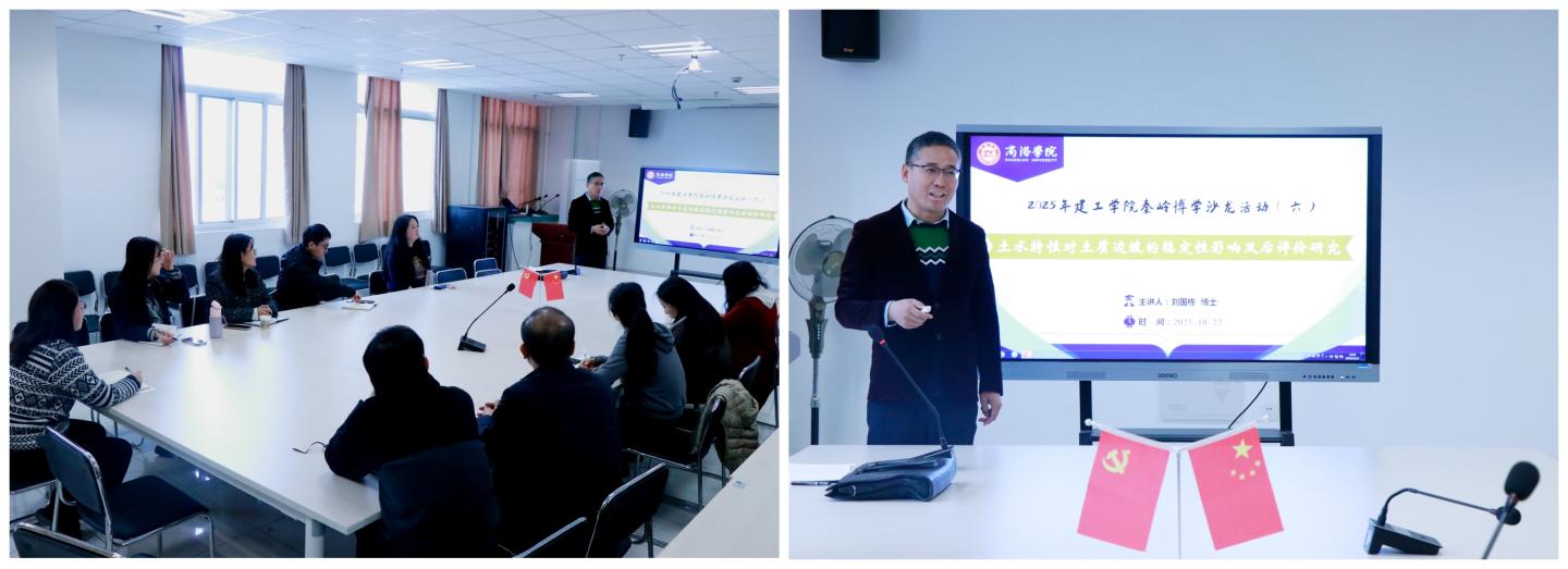活动由土木工程系主任曹琛主持,对本次活动的内容作了概括性介绍,由土木工程系刘国栋博士作学术报告《土水特性对土质边坡的稳定性影响及后评价研究》。刘国栋博士首先介绍了边坡稳定性分析中的理论与方法,描述了边坡工程运行中遇到的特殊问题,就土石坝坡在库水位升降过程中的稳定性展开探讨,发现土石坝迎水面和背水面边坡稳定系数的滞回现象,并就两者的一致性进行了分析。其后,刘国栋博士对黄土边坡受降雨影响的变形破坏机理进行了深入分析,以现场调查数据为基础,探析了黄土边坡治理效果良好的必要条件,并构建了黄土边坡后评价的模糊综合理论框架。报告紧扣主题,分析深入,展现了威尼斯官网科研一线教师的科研功底和科研风貌。